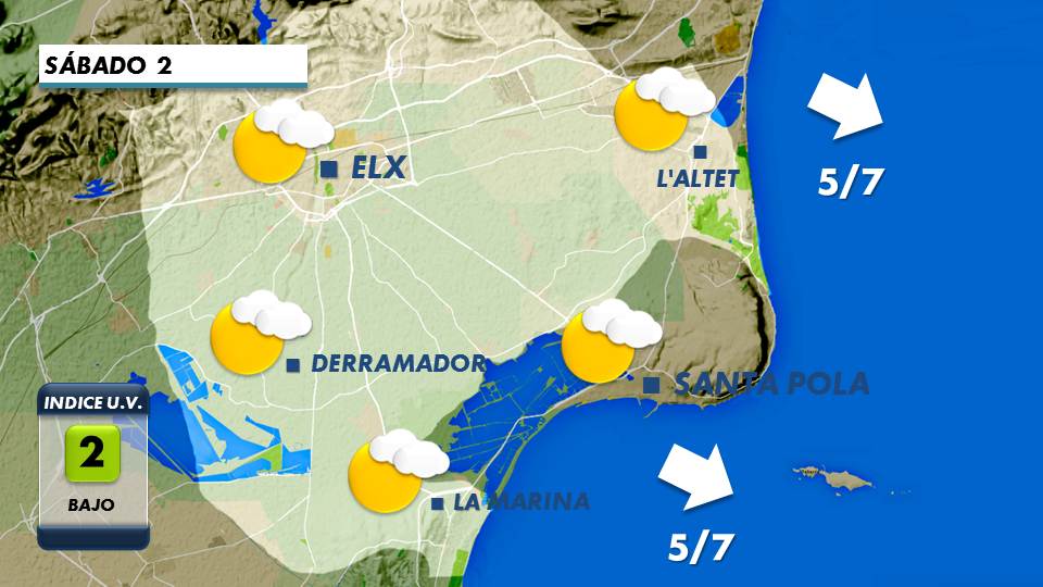 Con la retirada del aire frío en altura volverá la estabilidad atmosférica y subirán las temperaturas diurnas. Intervalos puntuales de nubosidad a primeras horas y después tendencia a cielos poco nubosos o despejados. Viento en calma por la mañana y flojo de levante por la tarde. Min 13ºC / Max 21ºC