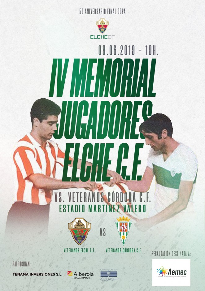 La Asociación de Veteranos del Elche C.F., en colaboración con el club, ha organizado el Memorial Jugadores del Elche, que este año celebra la cuarta edición. Los veteranos franjiverdes se enfrentarán en un partido de carácter benéfico a los del Córdoba el próximo 8 de junio, a las 19:00 horas, en el estadio Martínez Valero. La recaudación de la taquilla (la entrada tiene un precio de 2 eurosse donará a la Asociación de Esclerosis Múltiple de Elche y Crevillente.