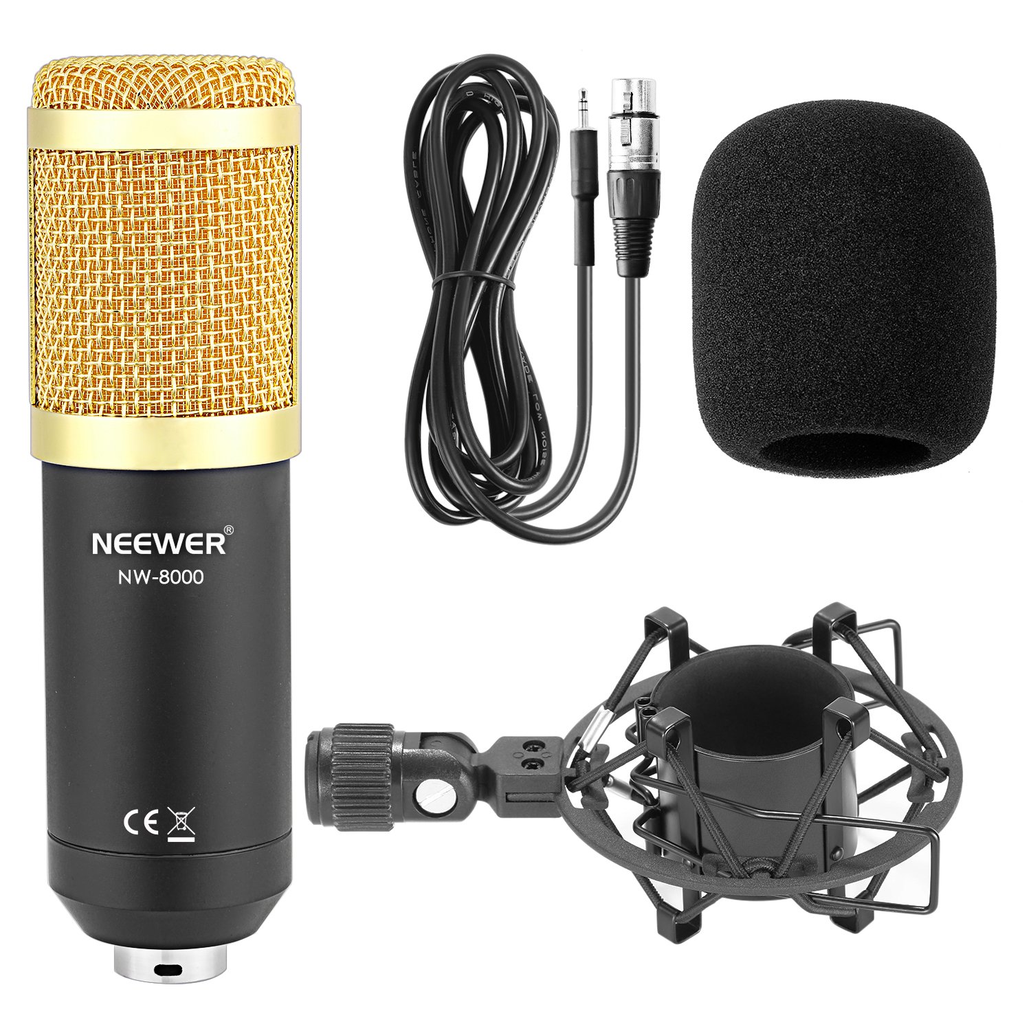 - El conjunto incluye:(1) micrófono de condensador profesional , (1) Monte de choque de micrófono , (1) tapón de espuma anti-viento tipo bola, (1) Cable XLR 3.5mm