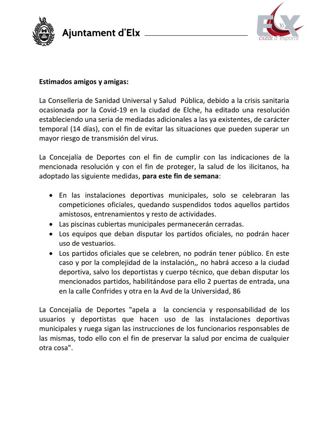 Elche sólo permitirá la disputa de partidos oficiales durante los próximos 14 días