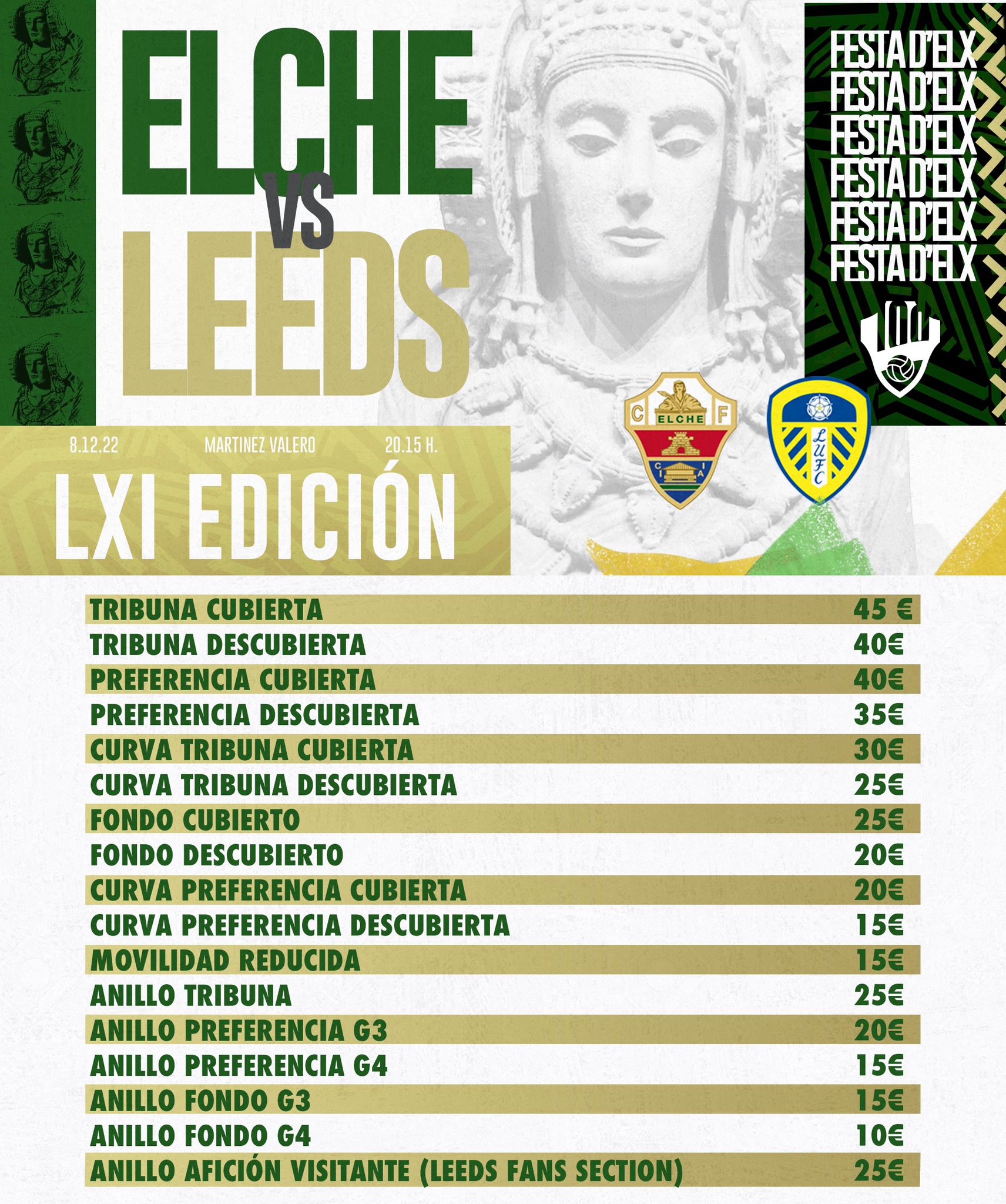 El Elche C.F. ha confirmado que la LXI edición del Trofeo Festa d’Elx se celebrará el jueves, 8 de diciembre, a partir de las 20:15 horas ante el Leeds United de la Premier League. Los abonados de este temporada podrán presenciar gratis el partido en el Martínez Valero, mostrando su carné, mientras que el resto de aficionados podrán adquirir sus entradas a partir de este miércoles, tanto de forma presencial como vía online. Los precios van desde los 10 euros la más barata, hasta los 45 la más cara.