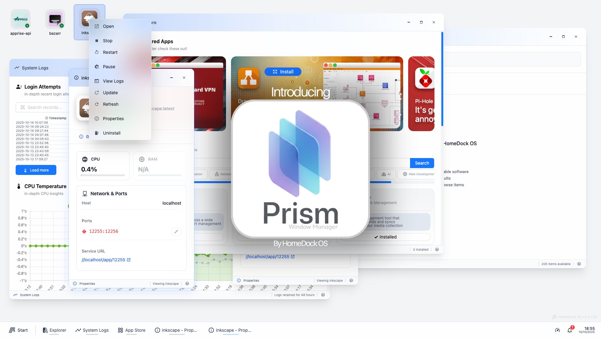 Se trata de un gestor de ventanas que ofrece multitarea real y que se ejecuta íntegramente en web, aunque visualmente asemeja a los típicos escritorios de ordenador. Así, la versión 2.0 de HomeDock OS incluye ventanas e iconos redimensionables y arrastrables con soporte para múltiples aplicaciones simultáneas. También, carpetas organizables, un menú de inicio, barra de tareas, búsqueda integrada desde el Explorer y estadísticas del sistema. Asimismo, cuenta con ajuste automático a la cuadrícula, tanto en móvil como en navegador, y con optimización para móvil con gestos táctiles y navegación por páginas.
