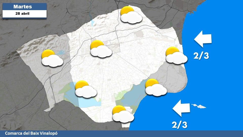La aproximación de aire frío en altura garantizará el paso de intervalos de nubosidad sin precipitaciones, pero con cielos nubosos hasta las horas centrales. Viento en calma por la mañana y flojo de componente este por la tarde. Min 13ºC / Max 22ºC